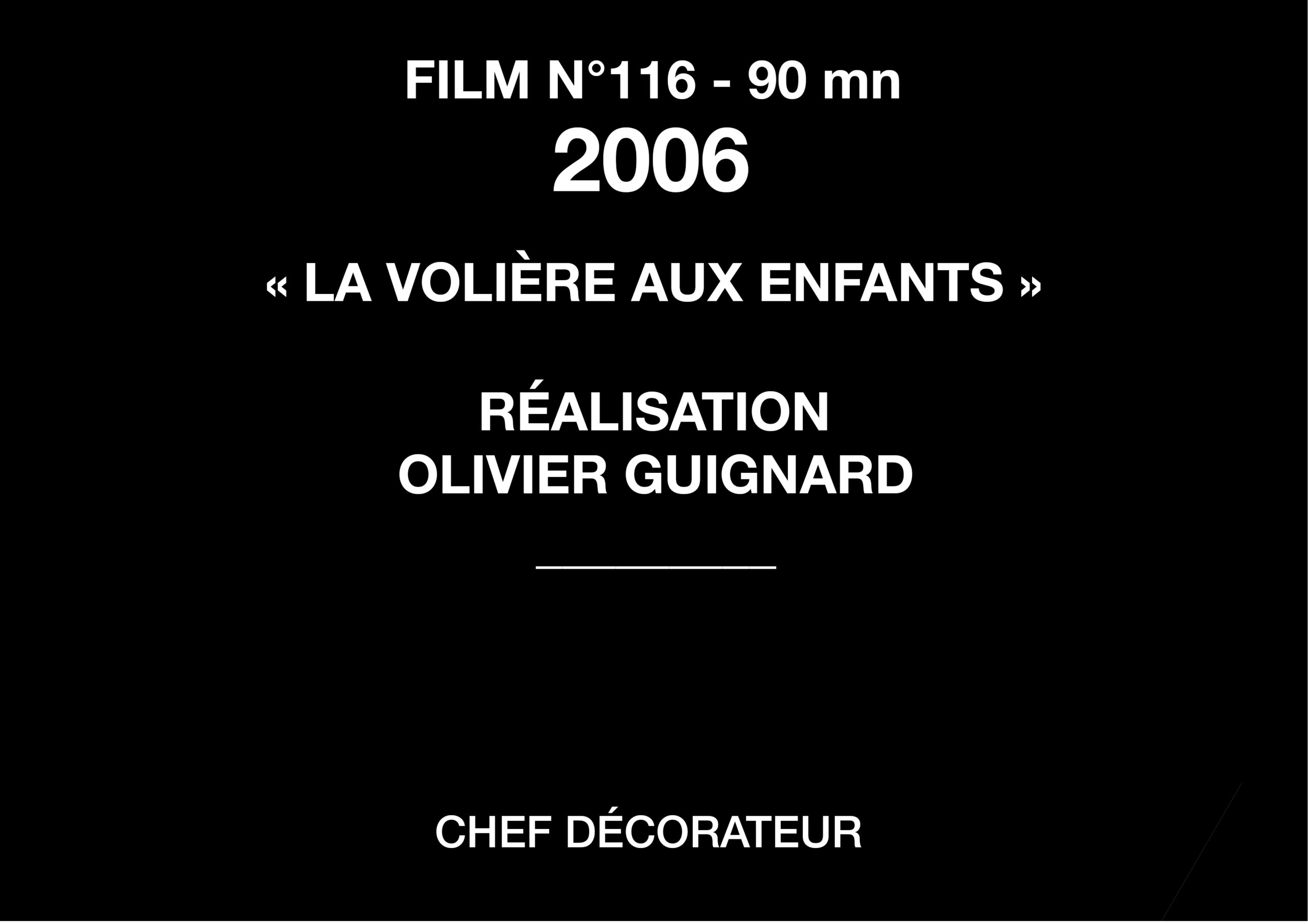 LA VOLIERE AUX ENFANTS Année: 2006 Genre: TÉLÉFILM Réalisateur: Olivier GUIGNARD Production: RASPAL PRODUCTION Fonction: CHEF DÉCORATEUR